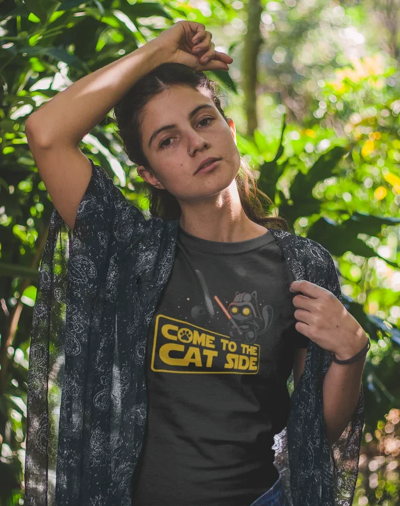 model wearing black t-shirt with black cat fun design come to the cat side
